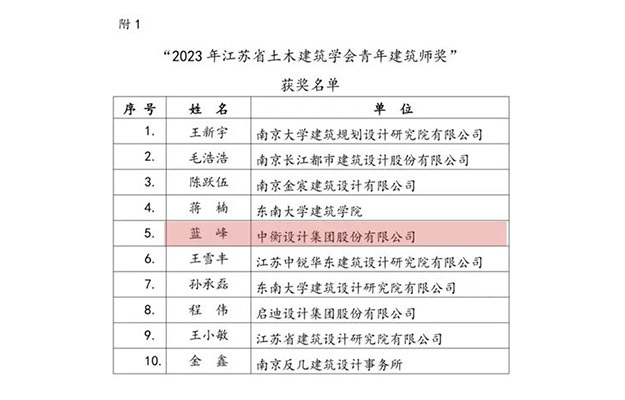 今年10月,江苏省土木建筑学会开展了首届“江苏省土木建筑学会青年建筑师奖”评选工作。经过严格审查、专业评审、综合评定后公示无异议,最终确定10位获奖人员,中衡设计集团蓝峰入选。